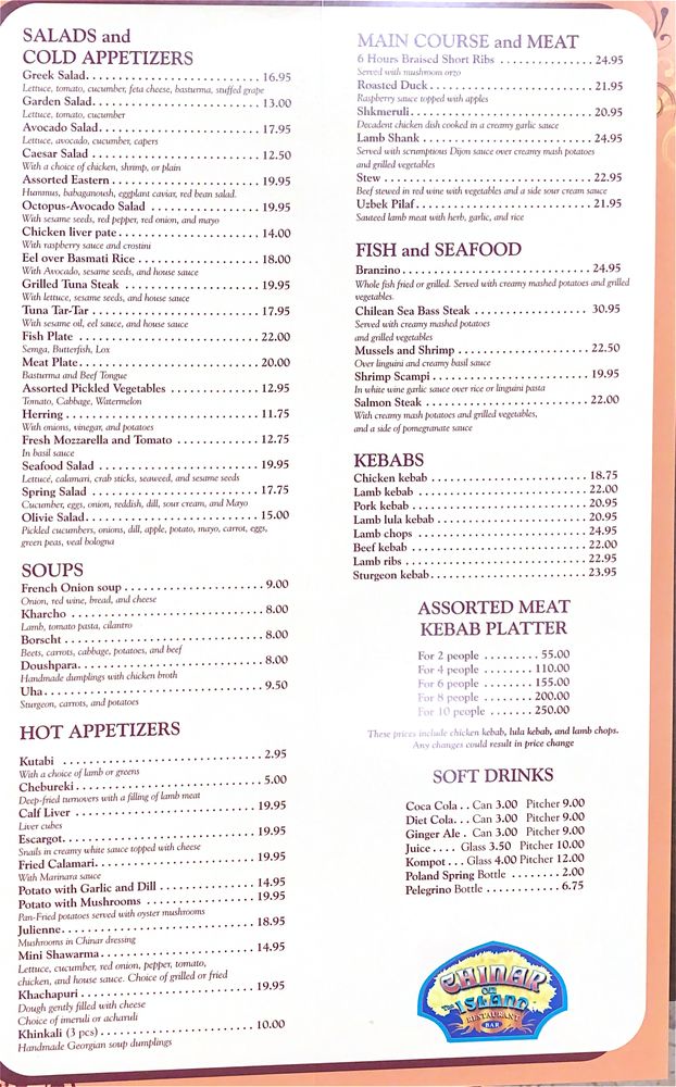 Welcome to Chinar On The Island, a culinary gem located at 283 Sand Ln, Staten Island. This venue isn’t just a bar; it’s a vibrant space where food and music collide in perfect harmony. The menu shines with a rich array of dishes, from the mouthwatering khachapuri to tender lamb shank, each bursting with flavor and crafted for a memorable dining experience.